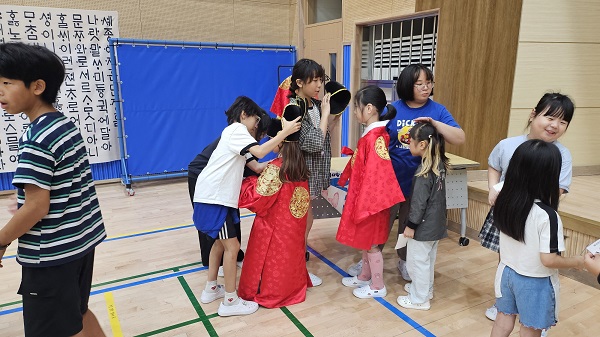 행사는 총 6개 체험 부스로 구성돼 5~6학년 학생들이 직접 운영했다. 주요 프로그램은 ▲낱말을 얼굴에 그려보는 페이스페인팅 ▲우리말 보드게임 ▲훈민정음 배경 전통 복식 포토존 ▲몸으로 자음 표현하기 ▲글자 카드 맞추기 놀이 ▲AI 기반 우리말 퀴즈 등으로 마련됐다. 학생들은 부스를 돌며 체험하고 스탬프를 모으며 친구·선배들과 결과물을 공유했다.
