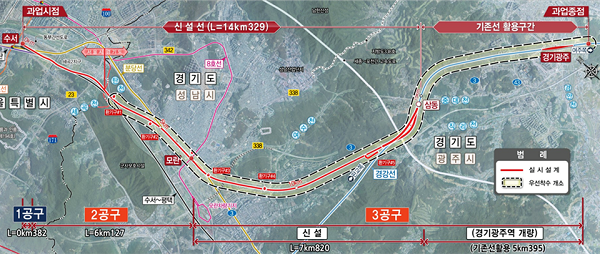 ‘수서~광주 복선전철’은 경기 동남권의 철도 교통망을 개선하고 수도권 강남권 접근성을 강화하기 위한 국가철도망 핵심 사업이다. 수서~광주 19.7㎞ 구간에 2개 신설역과 1개 개량역이 포함되며, 총사업비는 약 1조 1,233억 원이다.