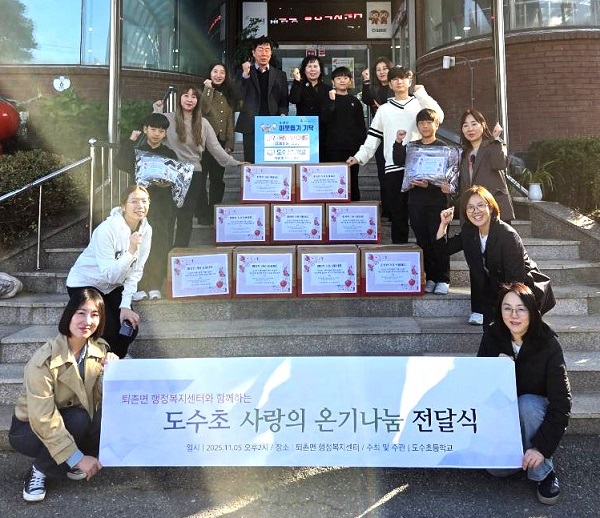광주 도수초등학교(교장 김정순)는 11월 5일(수) 오후 2시, 퇴촌면 행정복지센터(면장 김성환)에서 ‘사랑의 온기 나눔 전달식’을 열고 지역 어르신들께 따뜻한 마음을 전했다.