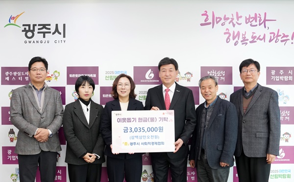 광주시 사회적경제협회 소속 사회적경제 기업들이 ‘2025년 광주시 사회적경제 나눔장터’를 통해 마련한 판매 수익금 303만 5천 원을 20일 광주시에 이웃돕기 성금으로 기탁했다.