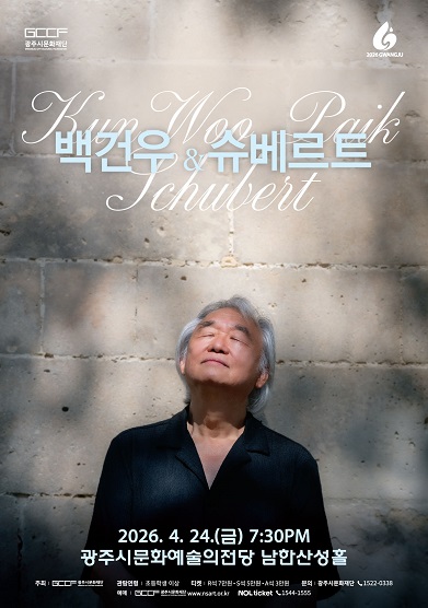 (재)광주시문화재단(대표이사 오세영)은 2026년 4월 24일(금) 19시 30분, 광주시문화예술의전당 남한산성홀에서 피아니스트 백건우 리사이틀 〈백건우와 슈베르트〉를 개최한다. 이번 공연은 데뷔 70주년을 맞이한 백건우가 오랜 시간 깊이 탐구해 온 슈베르트와 브람스의 작품을 통해 한 예술가의 깊은 사유와 현재진행형의 음악 세계를 선보이는 무대다.